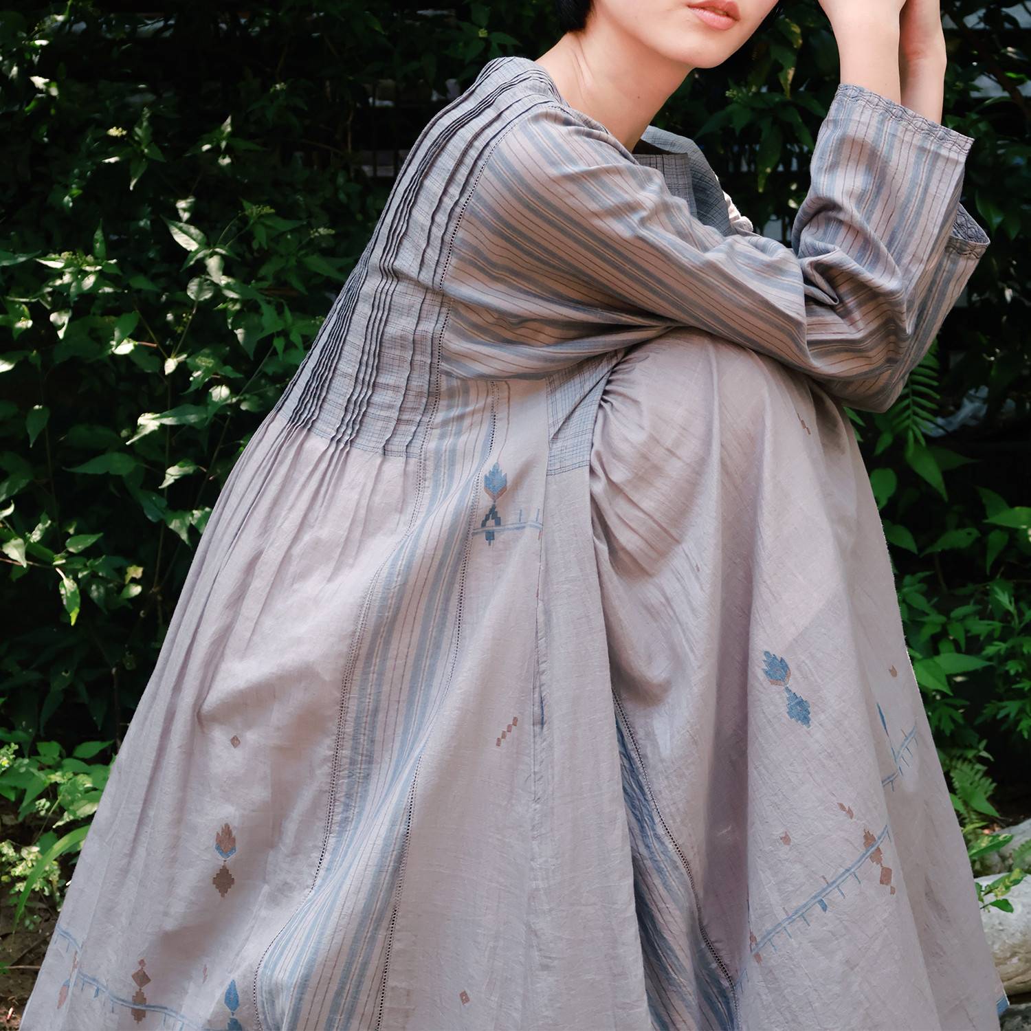 這些衣物然是使用相同的桑蠶絲、卡地棉,花費同等的心血打造而成;我們就著感恩的心,珍惜天賜的珍貴材料與可用的資源、感恩工匠們悉心織出的布料,讓這些無法一見鍾情的織品衣物,在您欣賞與呵護穿著下,展現美好。