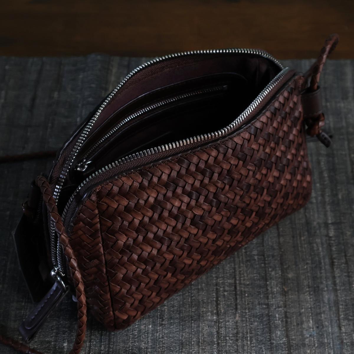 純色編織皮革斜背包,採用之字形編織工藝。