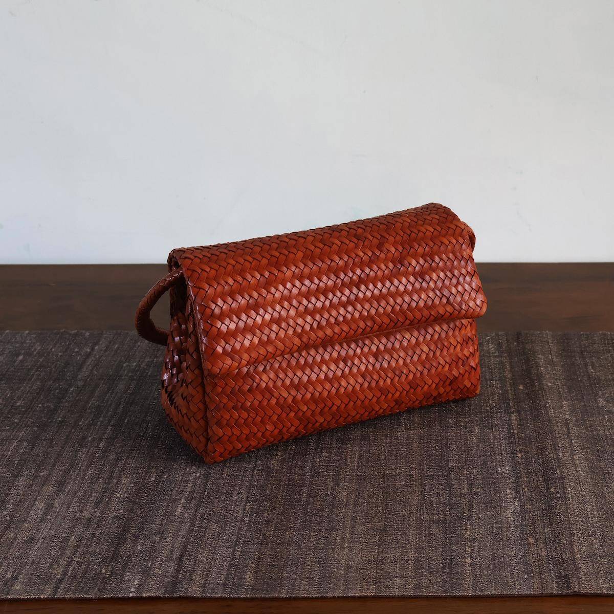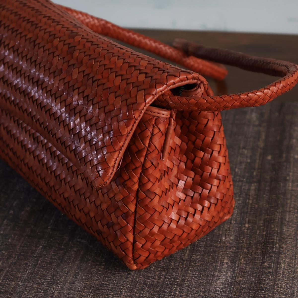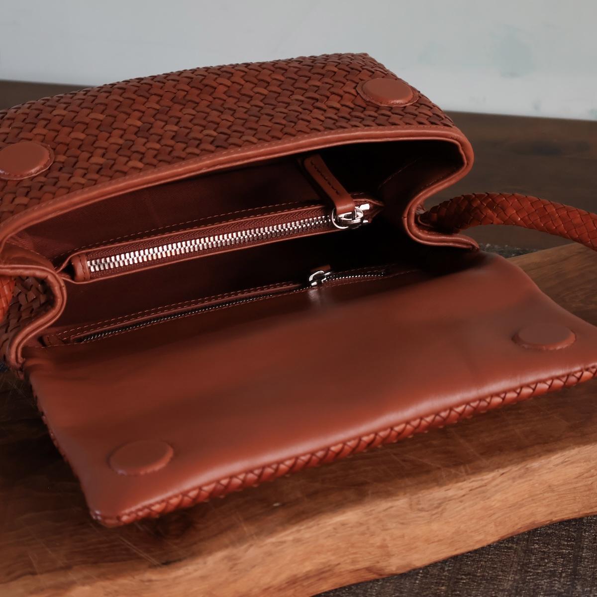 單色編織皮革斜背包,採用雙跳編織工藝,附翻蓋