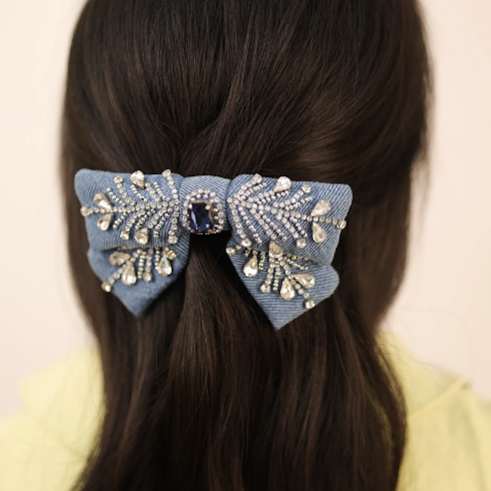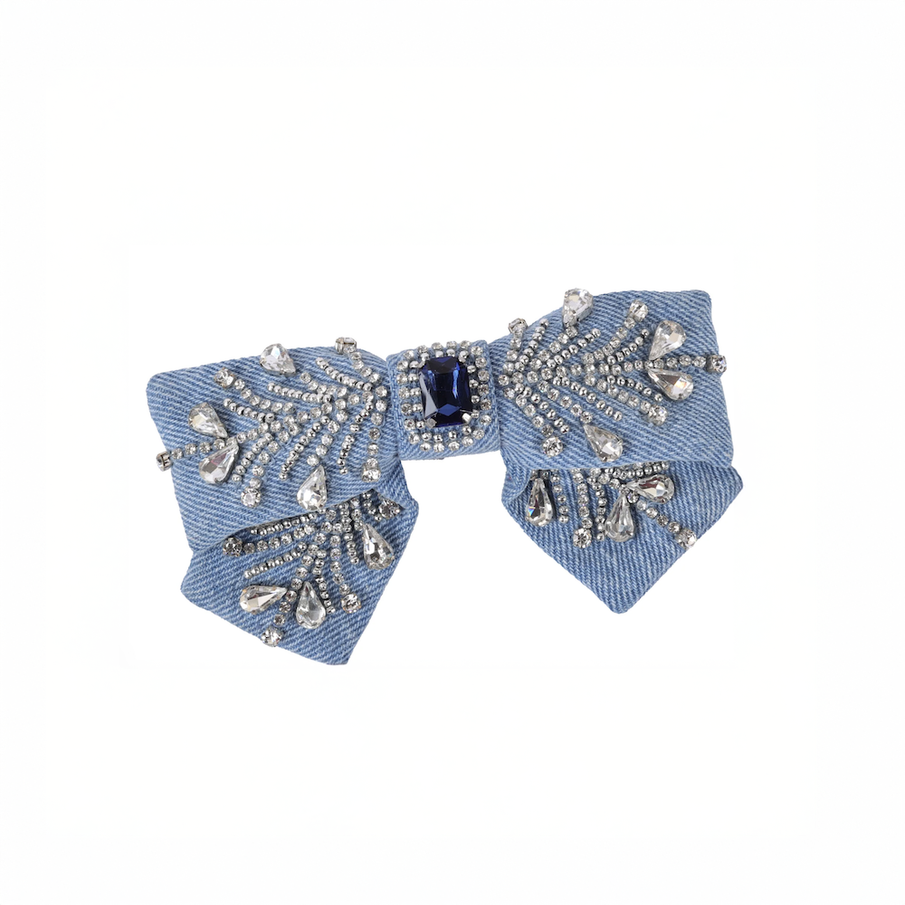 丹寧牛仔布蝴蝶結髮飾,點綴著閃耀的水鑽,中央鑲有一顆藍色寶石,為任何髮型增添一抹優雅氣息。