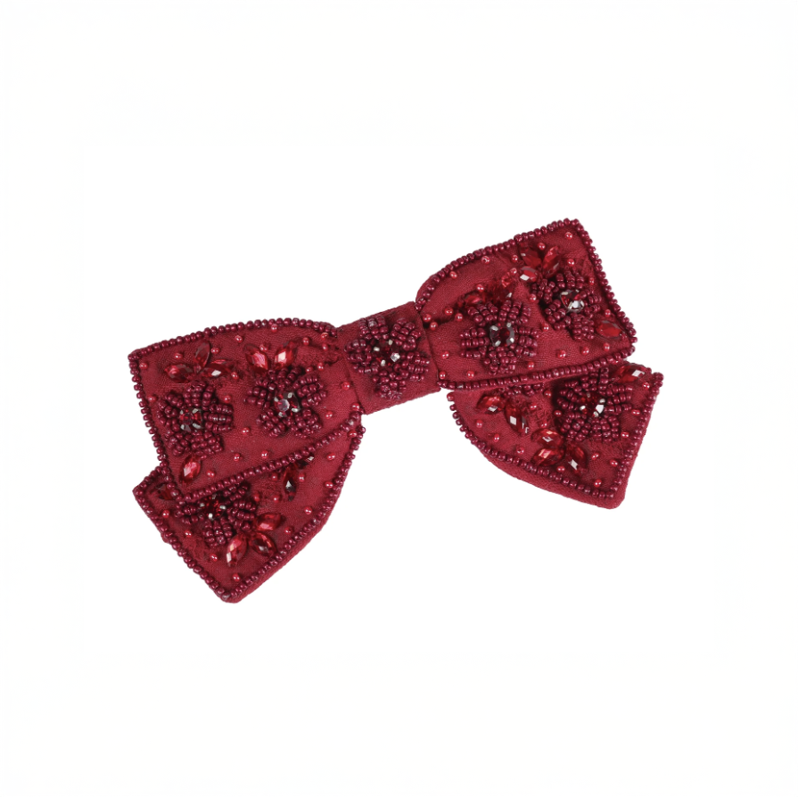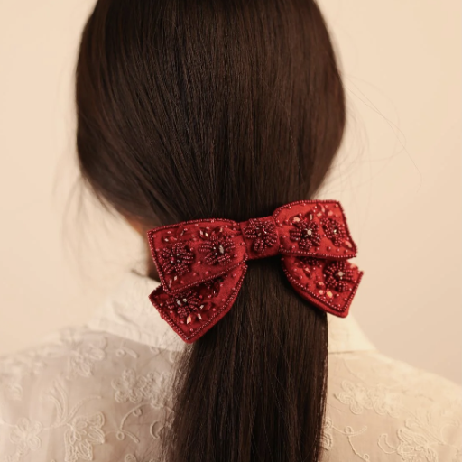顏色與材質: 蝴蝶結呈現濃郁的紅色調,並點綴精緻的珠飾與裝飾細節,營造出奢華高雅的視覺效果。