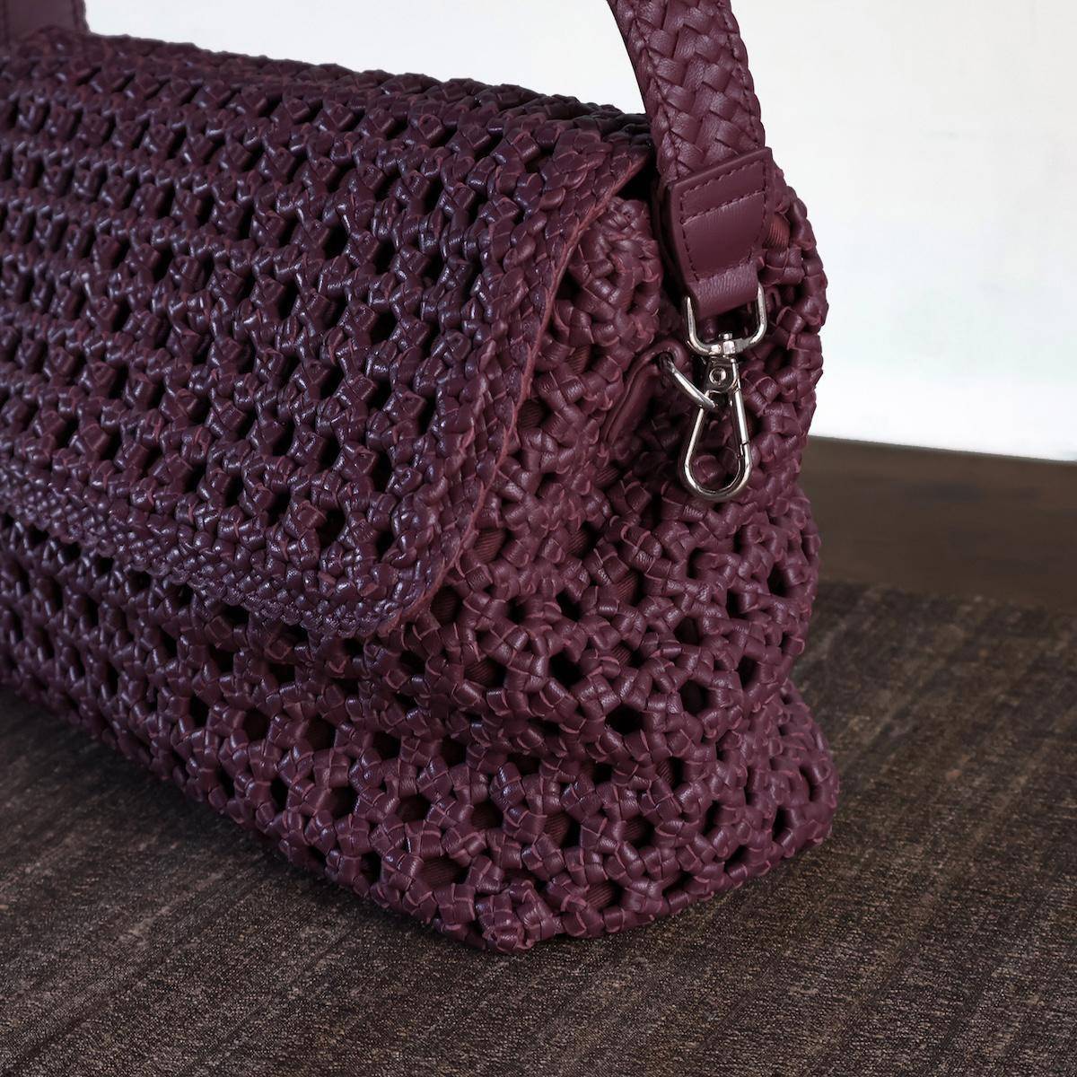 單色六角形編織皮革斜背包,附翻蓋