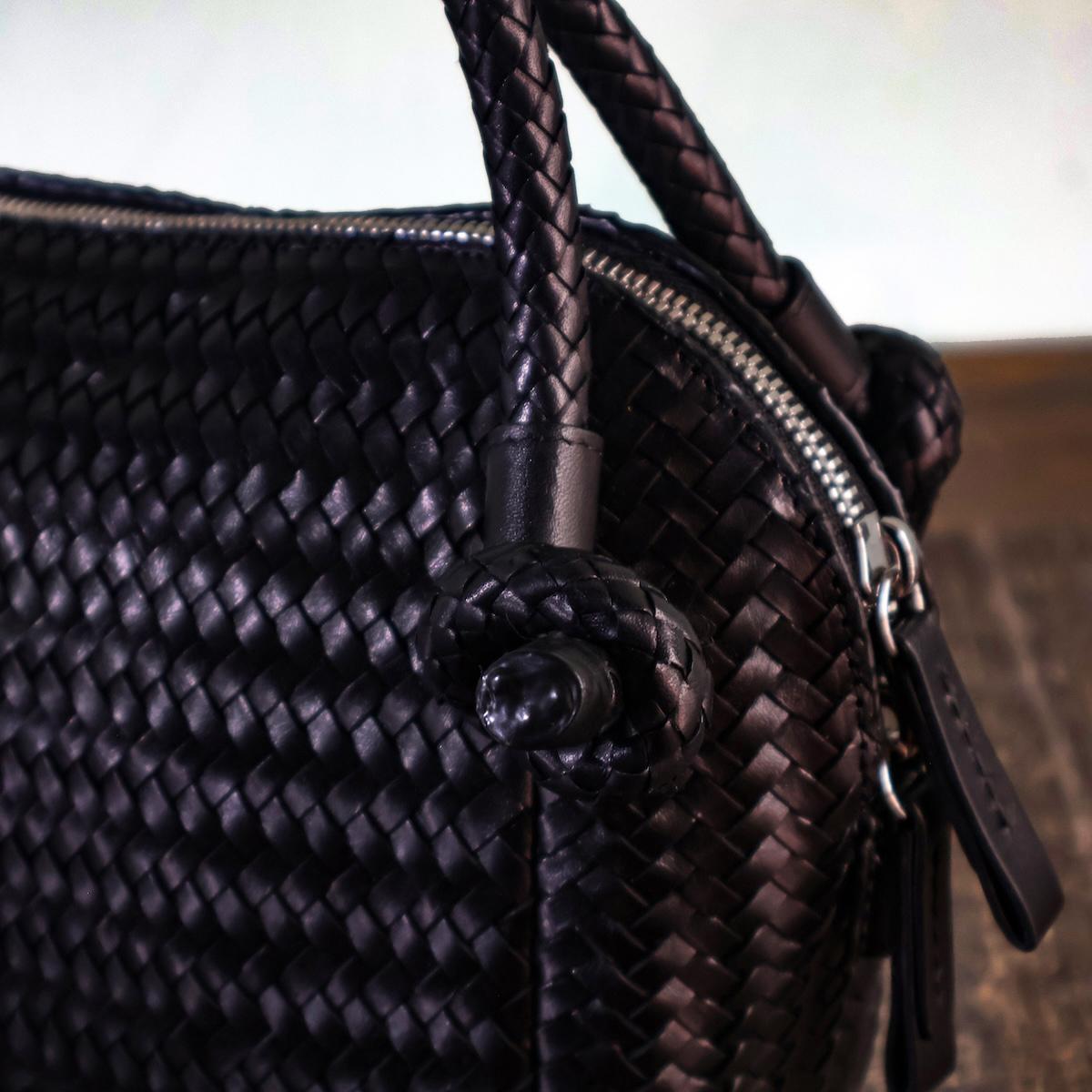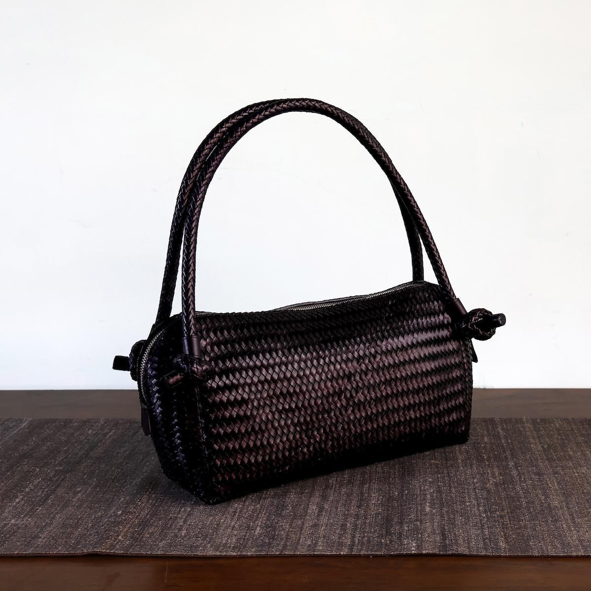 單色編織皮革肩背包,採用雙跳編織工藝。