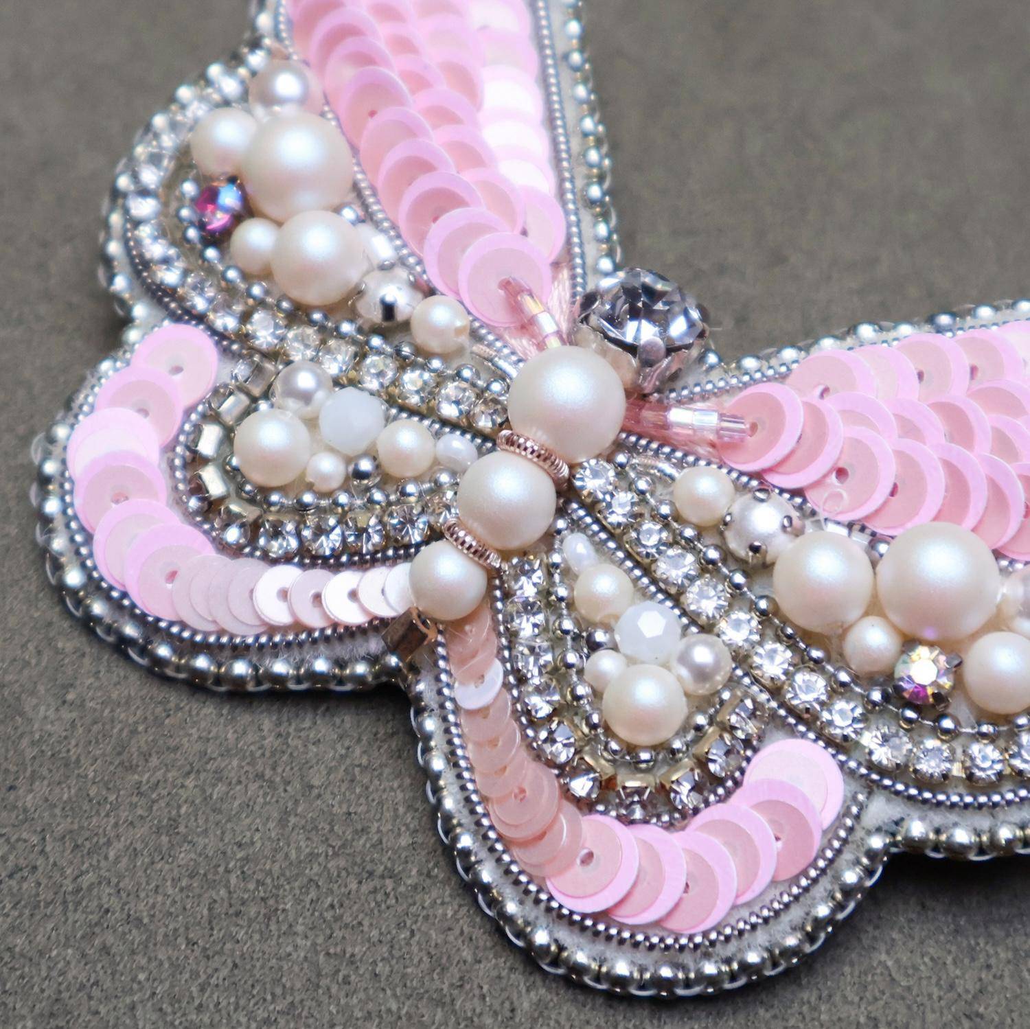 作品正面採用奧地利施華洛世奇水晶,並搭配日本珠、珍珠、鋯石與玻璃珠等精緻素材,拒絕使用塑膠或壓克力,呈現更純粹且細緻的光澤層次。細節之處同樣講究。每件作品背面皆以羊皮或牛皮封底,不僅提升整體質感,也兼顧耐用性,讓每一件飾品都能長久陪伴。